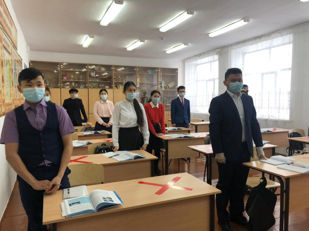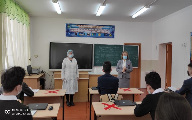 Кезекші сынып болып ашылған 9-сыныптың 110 оқушысы 13,14 оқушыдан 8 топқа бөлінсе, 11-сыныптың 68 оқушысы 15 оқушыдан 5 топқа бөлініп 13 кабинетке отырғызылды. Әр сынып кезең-кезеңімен арасына 10 минуттан үзіліс жасалып кіргізіліп, дене қызуы (тепловизормен) өлшеніп, антисептикпен қолдары жуылып, кабинеттеріне кіргізілді. Антисептиктер бірінші қабатта-2, екінші қабатта-2, үшінші қабатта -1, төртінші қабатта-біреуден қойылса, әр кабинетте жеке-жеке қойылған. Әр кабинетке дезинфекциялық кілемшелер төселген. Сабақ басталғанға дейін оқушыларға санитарлық норманы сақтау мен сақтық шаралары туралы түсінік жұмыстарын үздіксіз жүргізіліп отырады. Сабақ уақытында қоңырау кестесіне сай әр екінші сабақтан кейін ылғалды тазалық жұмыстары жүргізіліп отырады.