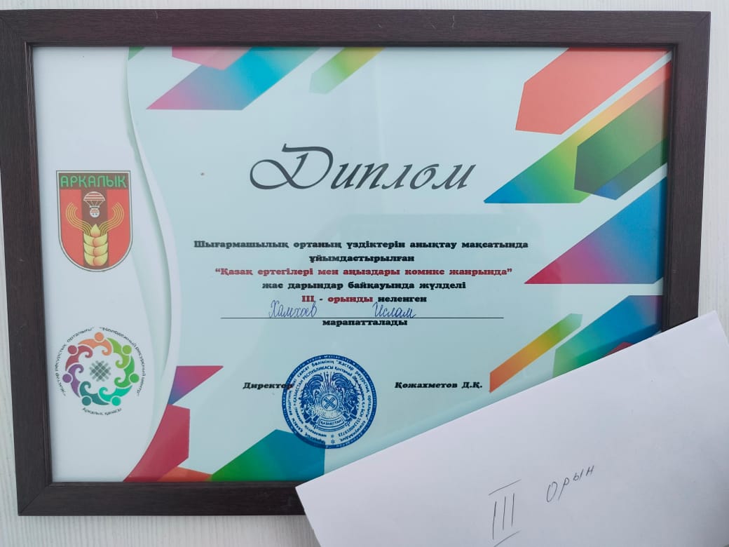 Шығармашылық ортаның үздіктерін анықтау мақсатында Арқалық қаласы әкімдігінің ішкі саясат бөлімінің "Жастар" ресурстық орталығы ұйымдастырған "Қазақ ертегілері мен аңыздары комикс жанрында" жас дарындар байқауында жүлделі ІІІ орынды Хамхоев Ислам және Толстыкина София жеңіп алды.