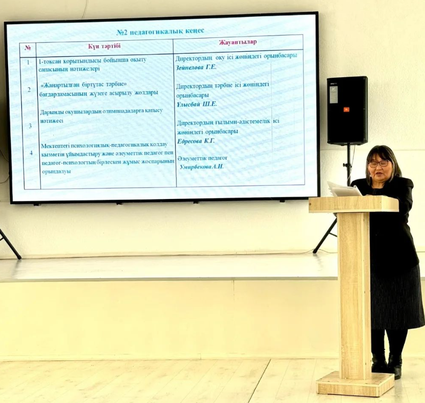 2024 жылдың 29 қазан күні жоспарға сәйкес Педагогикалық кеңес өтті. Кеңес күнтәртібінде: 1 - тоқсан қорытындысы бойынша оқыту сапасының нәтижелері; «Жаңартылған біртұтас тәрбие» бағдарламасының жүзеге асырылу жолдары; Дарынды оқушылардың олимпиадаларға қатысу нәтижесі; Мектептегі психологиялық-педагогикалық қолдау қызметін ұйымдастыру және әлеуметтік педагог пен педагог - психологтың бірлескен жұмыс жоспарының орындалуы туралы мәселелер қаралды. Кеңес соңында күнтәртібінде қаралған мәселелер бойынша шешімі шығарылып, ұсыныстар берілді.