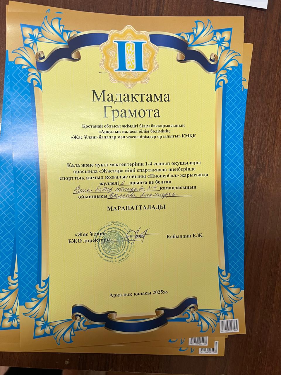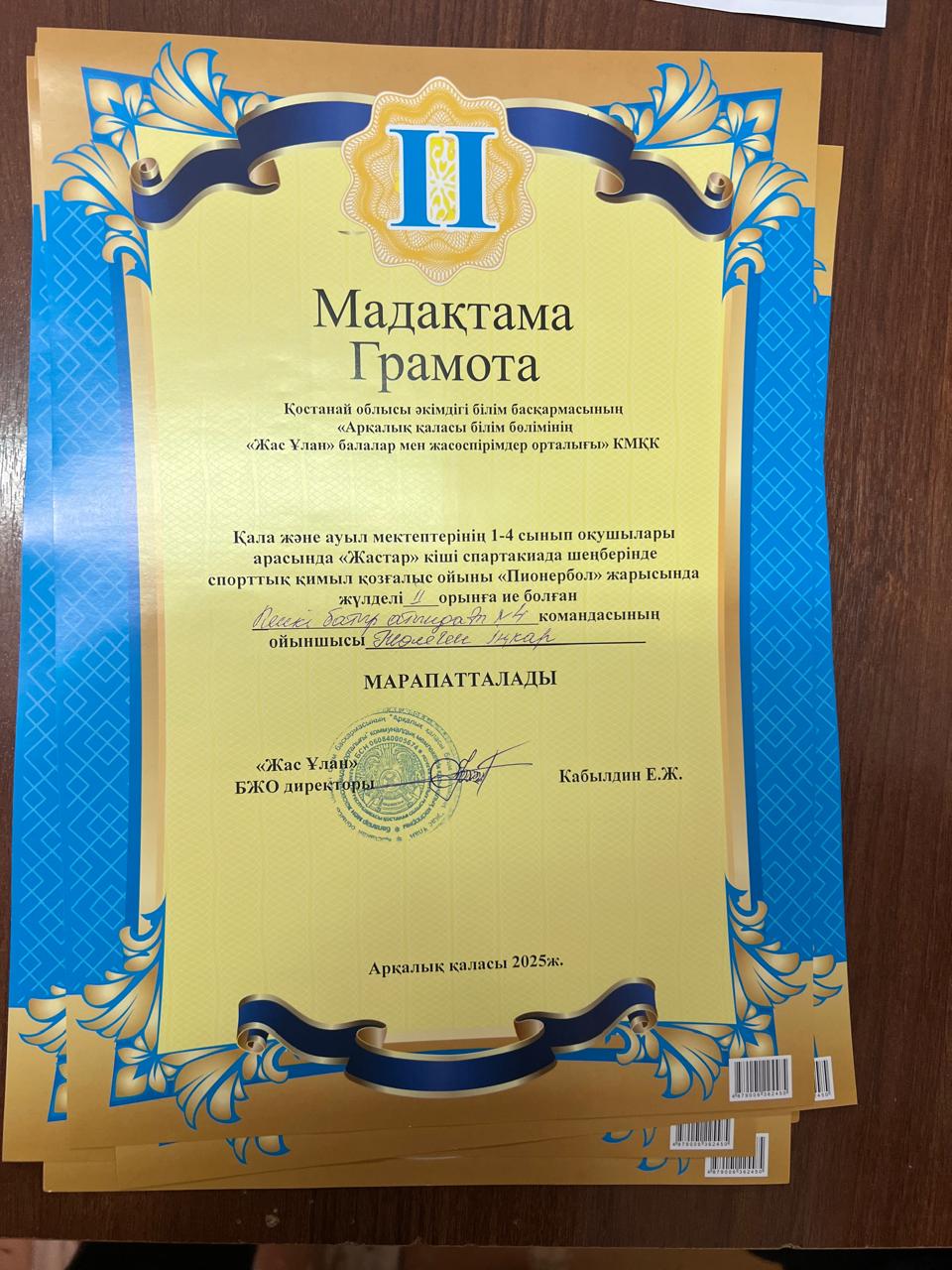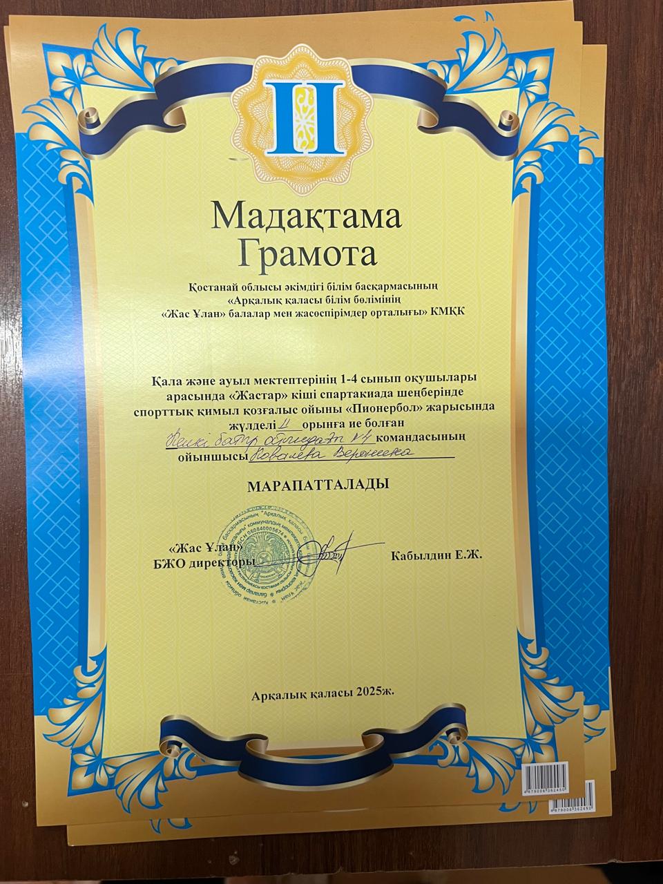 2025 жылдың 11 - 12 ші желтоқсан күні аралығында «Жас Ұлан» балалар мен жасөпірімдер орталығының ұйымдастыруымен, қала және ауыл мектептерінің бастауыш 1 - 4 сынып оқушыларына арналған «Жастар» кіші спартакиада шеңберінде спорттық қимыл қозғалыс ойыны қыздар арасында Пионербол жарысы өткізілді. Жарысқа барлық қала мектептерінен және ауыл мектебінен 2 команда келіп, жалпы саны бойынша 14 командадан 120 дан астам оқушы қатысты. Тартысты ойында команда ойыншылары әр - түрлі айла тәсілдерін қолдана отырып жеңіске қол жеткізді. Барлық командалар жақсы дайындықпен келді, күш жігерліктерін салып ең мықтысы жоғары ұпаймен жеңіске жетті.