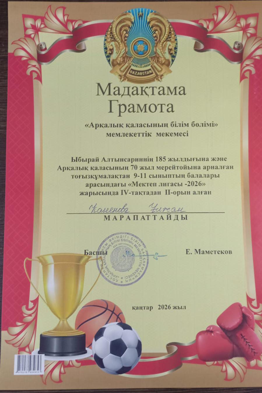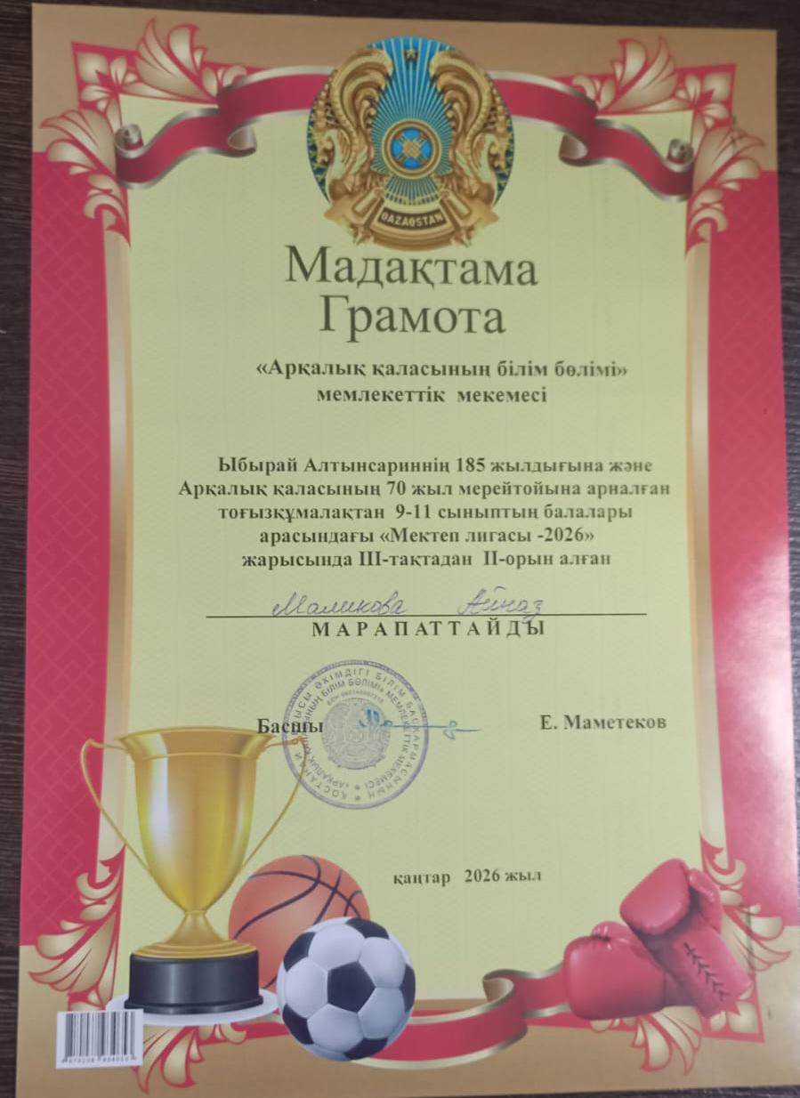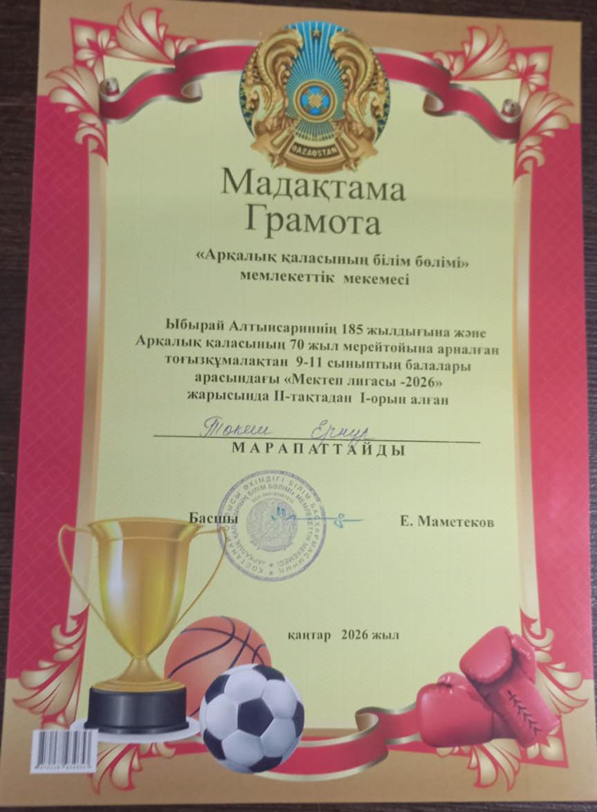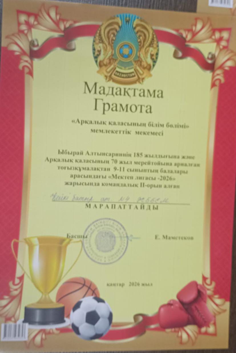 Ыбырай Алтынсариннің 185 жылдығына және Арқалық қаласының 70 жыл мерейтойына арналған тоғызқұмалақтан 9-11 сыныптың балалары арасындағы "Мектеп лигасы 2026" жарысында командалық есепте ІІ орынға Кейкі батыр атындағы №4 жалпы білім беретін мектебі жеңіп алды.