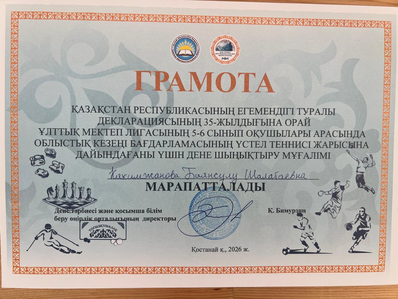 Аталған марапат – ұстаздың кәсіби шеберлігі мен оқушыларды спортқа баулудағы елеулі еңбегінің айқын дәлелі. Оқушылардың жетістіктері мен белсенділігі – мұғалім еңбегінің жемісі.