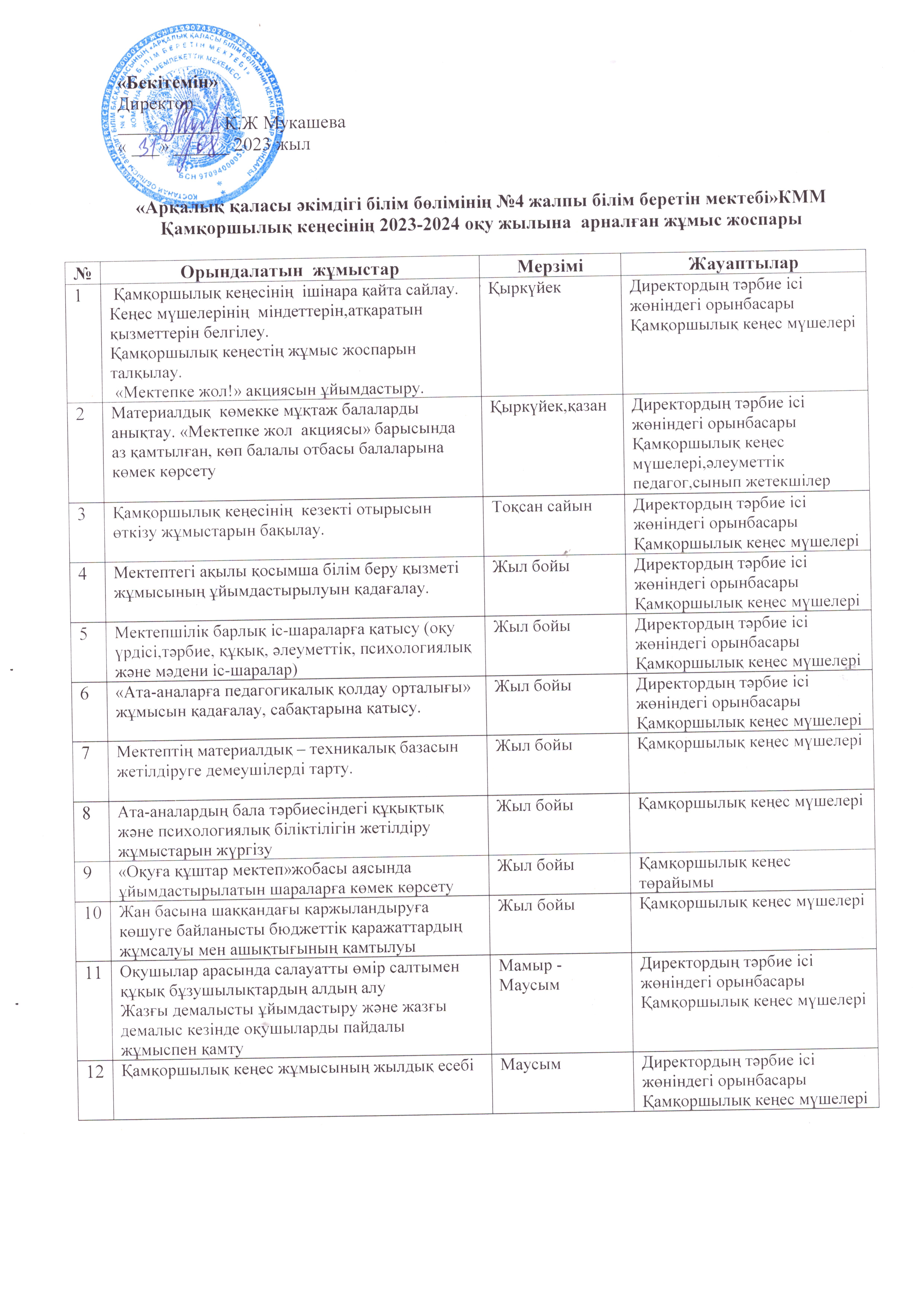 Қамқоршылық кеңесінің 2023 - 2024 оқу жылына арналған жұмыс жоспары