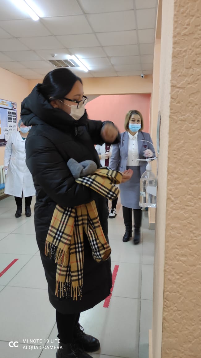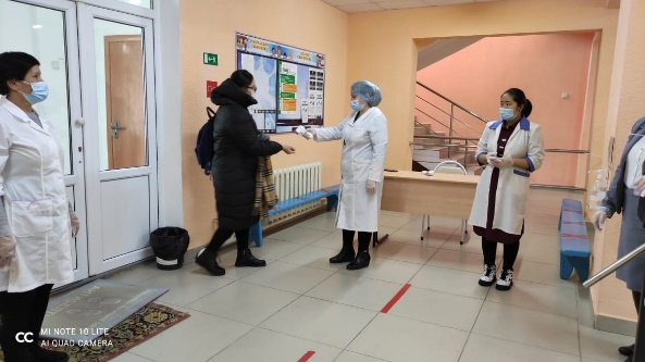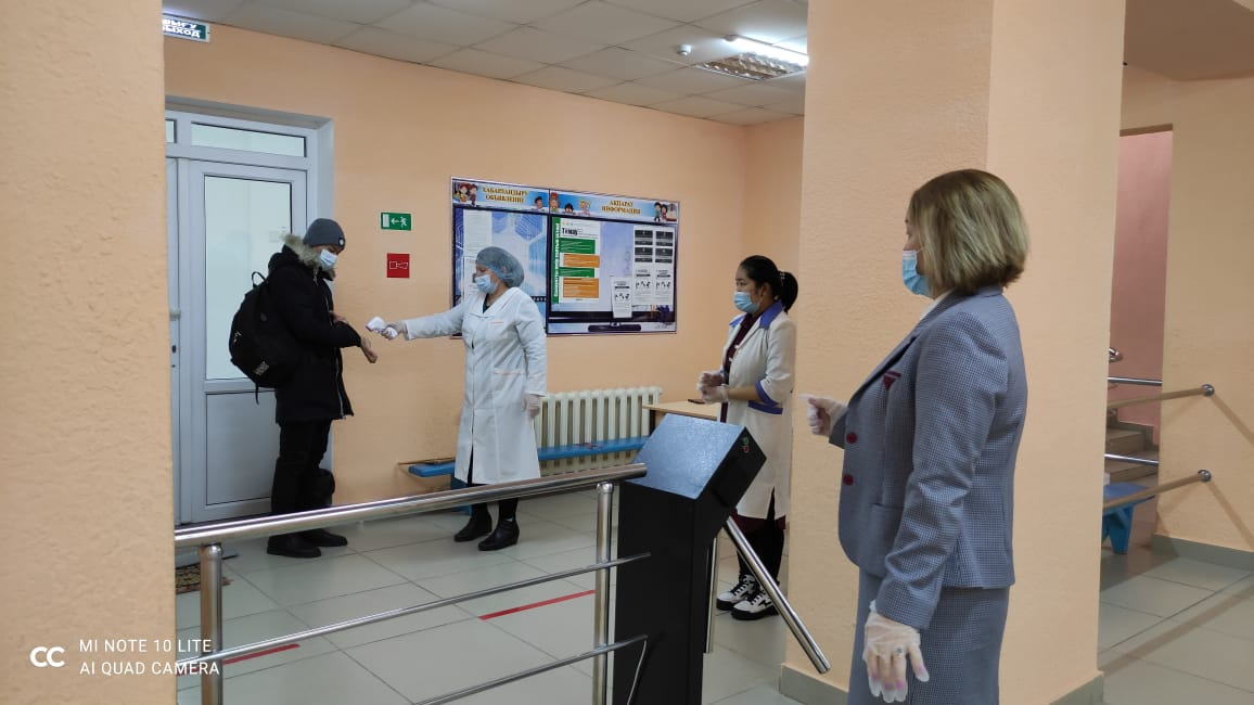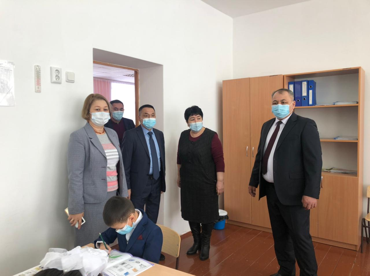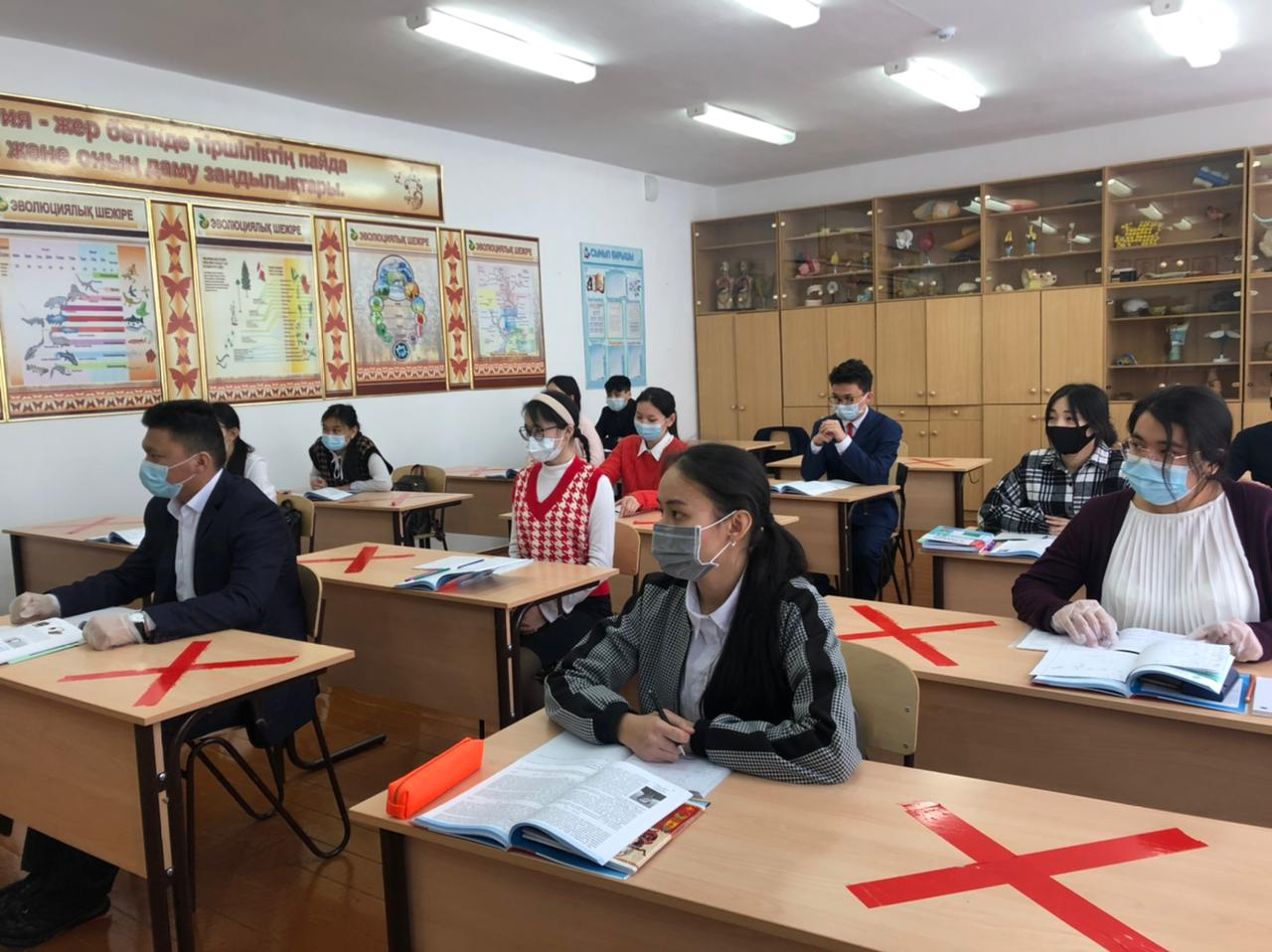 Кезекші сынып болып ашылған 9-сыныптың 110 оқушысы 13,14 оқушыдан 8 топқа бөлінсе, 11-сыныптың 68 оқушысы 15 оқушыдан 5 топқа бөлініп 13 кабинетке отырғызылды. Әр сынып кезең-кезеңімен арасына 10 минуттан үзіліс жасалып кіргізіліп, дене қызуы (тепловизормен) өлшеніп, антисептикпен қолдары жуылып, кабинеттеріне кіргізілді. Антисептиктер бірінші қабатта-2, екінші қабатта-2, үшінші қабатта -1, төртінші қабатта-біреуден қойылса, әр кабинетте жеке-жеке қойылған. Әр кабинетке дезинфекциялық кілемшелер төселген. Сабақ басталғанға дейін оқушыларға санитарлық норманы сақтау мен сақтық шаралары туралы түсінік жұмыстарын үздіксіз жүргізіліп отырады. Сабақ уақытында қоңырау кестесіне сай әр екінші сабақтан кейін ылғалды тазалық жұмыстары жүргізіліп отырады.