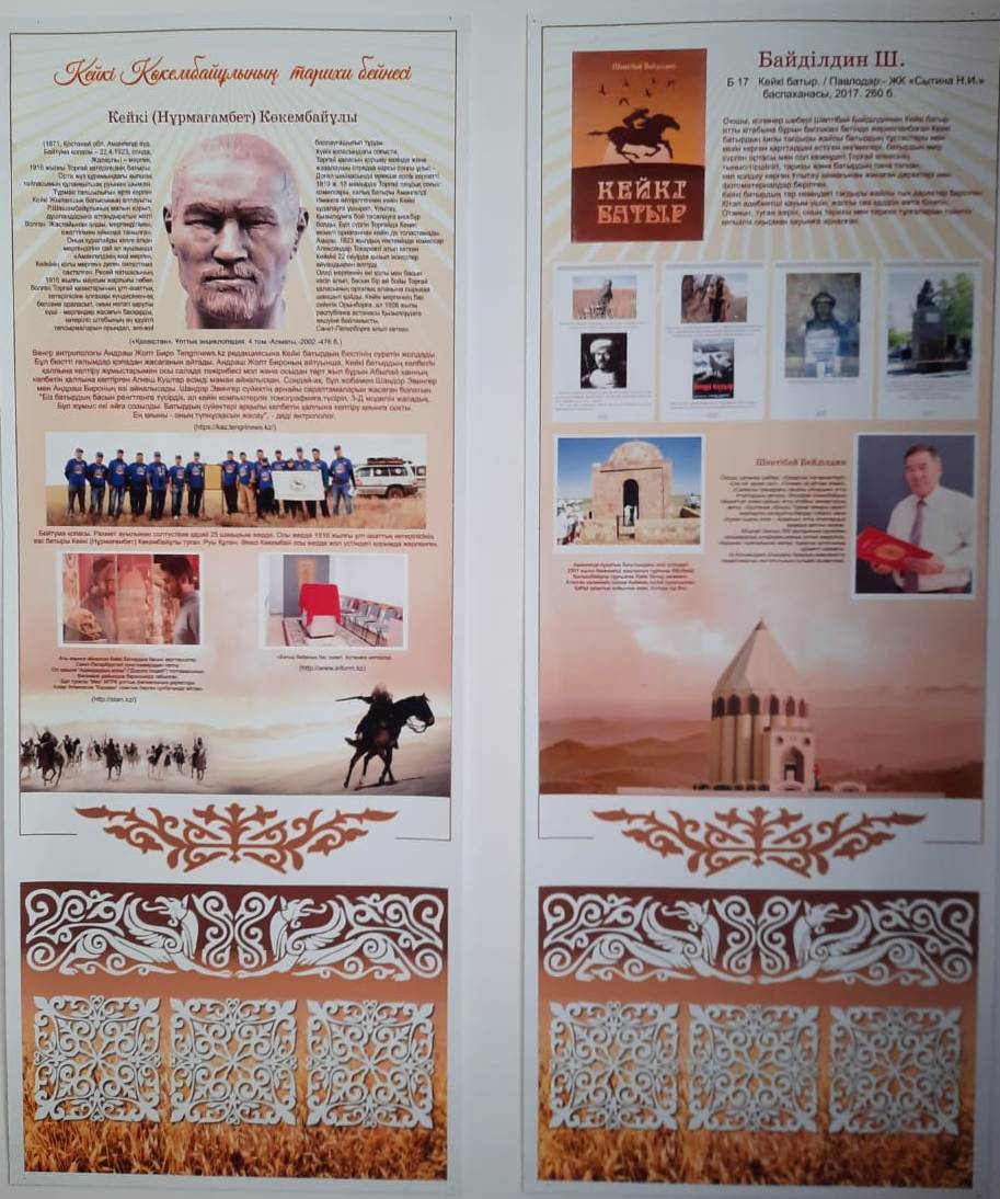 Батырдың ерлігі ешқашан ұмытылмайды. Мұражайымыздың төрінде Кейкі Көкембайұлының тарихи бейнесі өмір деректерінен мәлімет беретін экпозиция қойылған. Сонымен қатар Алаш қозғалысы-тарих тағылымы тақырыбында Алаш зиялыларының жарқын бейнесі тізбектелген экпозияцияны көре аласыздар. Қазақтың кешегі өшпес ерлігімен ел есінде қалған Алаш зиялыларын және Ұлт батырларын ұлықтап келе жатқан зерттеуші ақын-ғалымдарымызға арналған жеке экспозиция қойылды. 2010жылы Арқалық қаласындағы Дала өлкесі тарихы облыстық мұражайының алаңында орнатылған Кейкі Көкембайұлына арналған ескерткіштің ашылу салтанатының өту барысында түсірілген фото суреттерден құралған экпозициямызды көре аласыздар. Бүгінде ол ескерткіш Киелі шаңырағымыз білім ордамымыздың алаңына ауыстырылып қойылды. Бейне шежіре деп аталатын экпозициямызда батыр бабамызға арналған кесенелермен Торғай облысы картасын көре аласыздар. 1916жылғы Ұлт-азаттық қозғалысқа арналған көрмелер мен Кейкі мерген деп аталатын жаңадан жарық көрген телехикаяның киномотографиялық кадр фотолары қойылған. Елге оралған есім деп аталатын бұрышымызда Кейкі мергеннің анропологтардың зерттеу барысындағы бас сүйектің қалыпқа келген нұсқаларымен Ел рухының еңсесін көтерген батырымызға арналып салынған Кейкі батырдың бас сүйегі жерленген кесенесінің фото суреттерімен мәліметтері қойылған.Сонымен қатар көптеген баспалардан жарық көрген кітаптар газеттер, журналдар және Батыр бабамыздың ұрпақтарының суреттері қойылған экпозициямен ветриналар бар. Кейкі Көкембайұлынан қалған жалғыз құнды жәдігер ол Кебеже. Кебеже қамыздағы киелі қара шаңырақ Арқалық қаласындағы дала өлкесі тарихы облыстық мұражайында сақтаулы тұр.