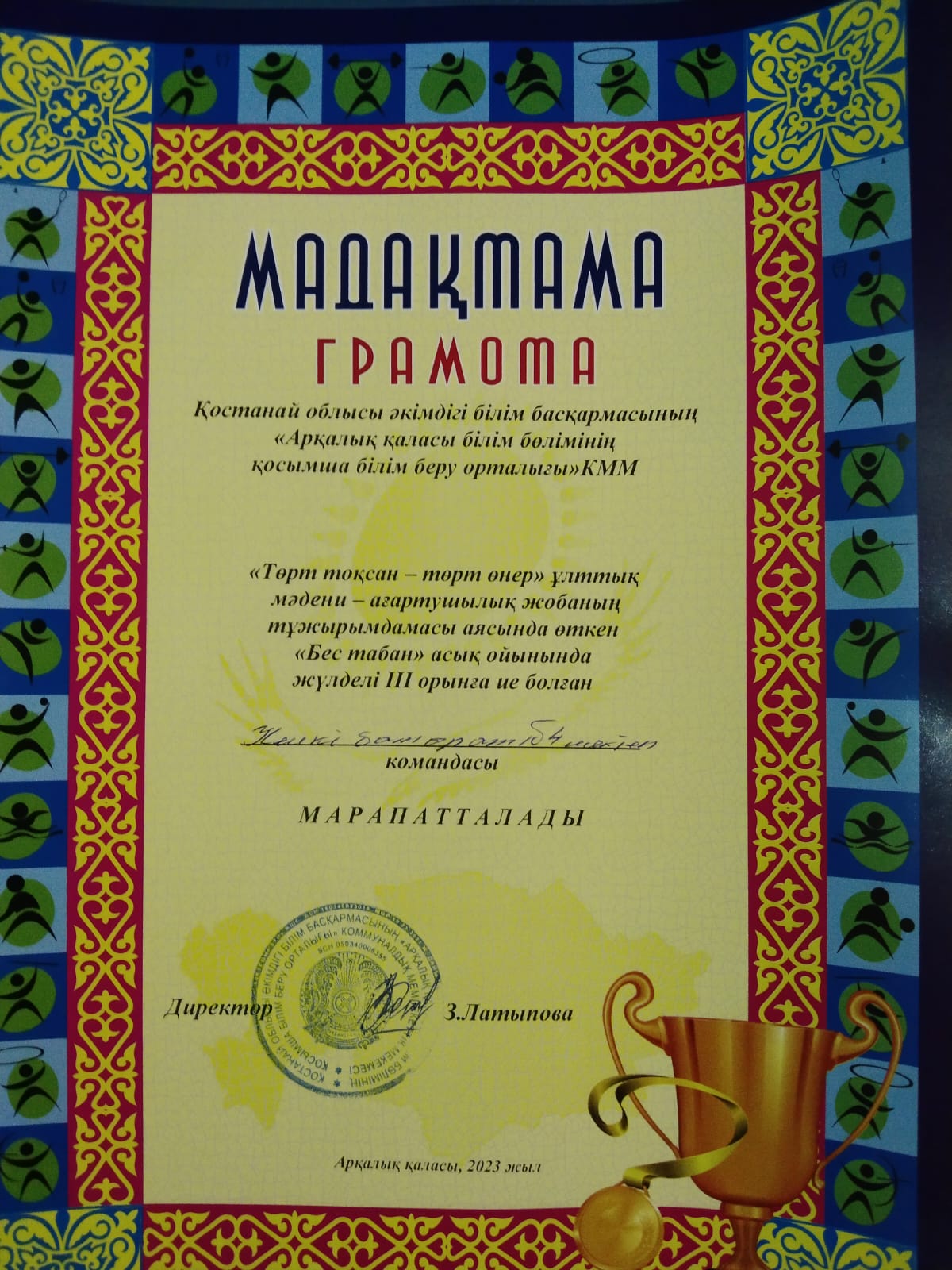 «Төрт тоқсан — төрт өнер» ұлттық мәдени-ағартушылық жобаның аясында өткен «Бес табан» асық ойынында мектеп командасы ІІІ орынға ие болды.