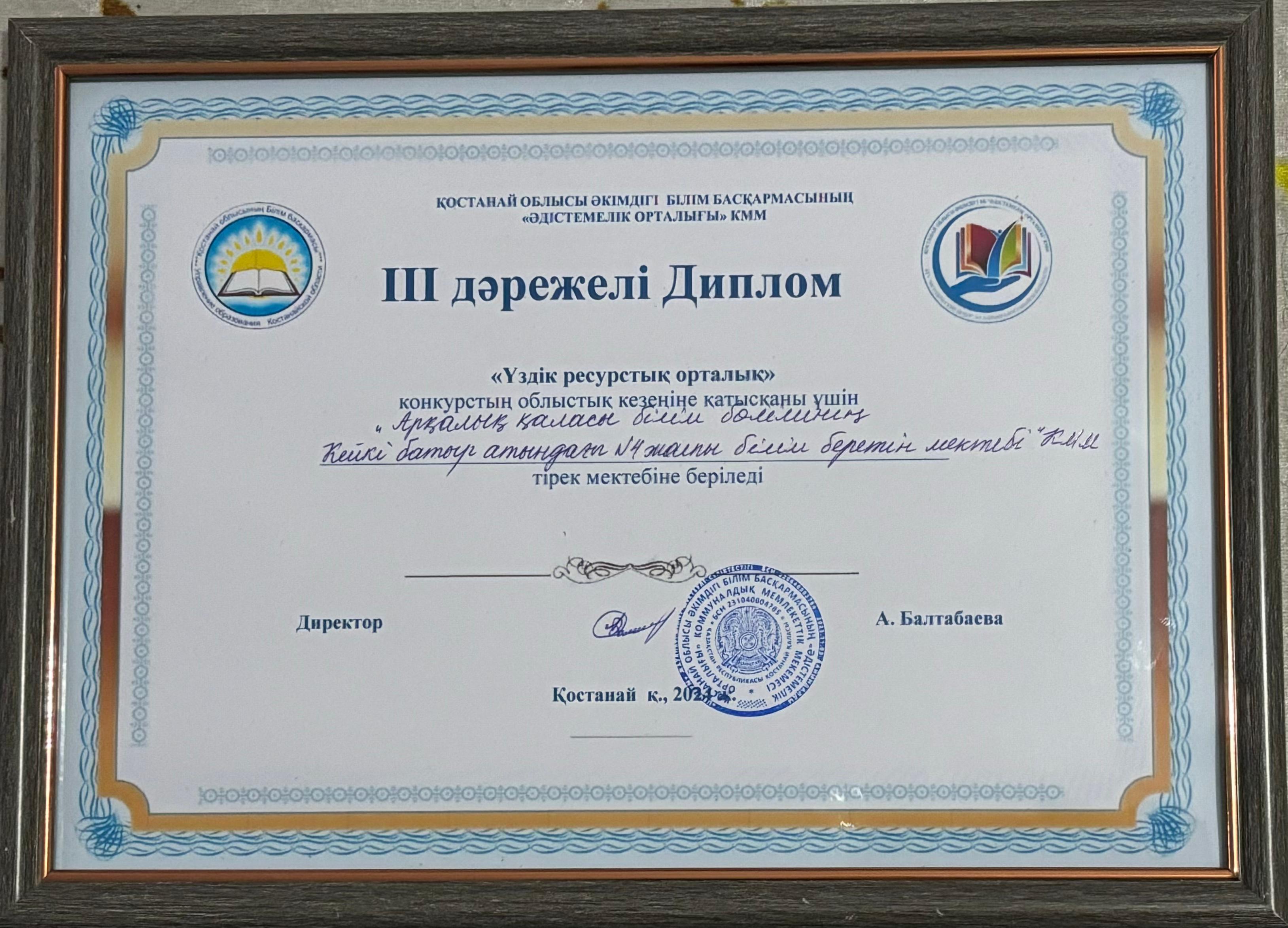 Қостанай облысы әкімдігі білім басқармасының «Әдістемелік орталығы» КММ ұйымдастырған облыстық «Үздік ресурстық орталығы» байқауна мектебізден директордың ғылыми ісі жөніндегі орынбасары Байахмет Талғат Жауынгерұлы қатысып жүлделі ІІІ орын иеленіп келді.