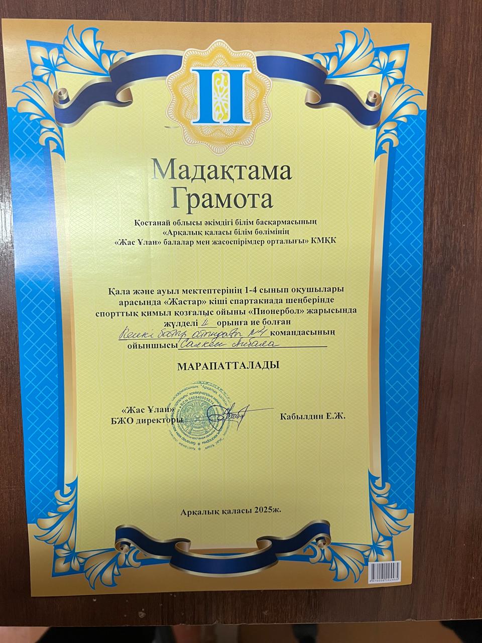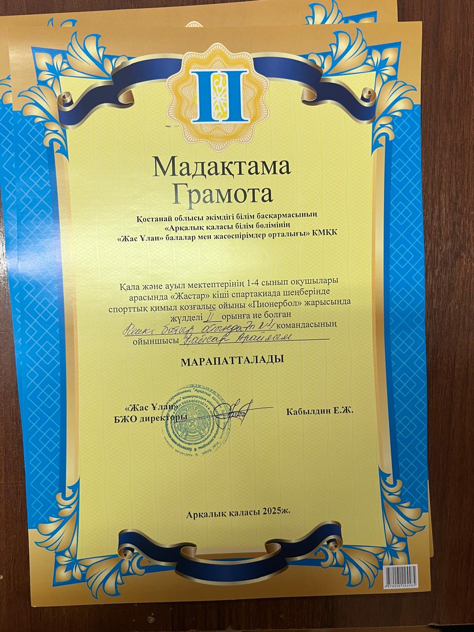 2025 жылдың 11 - 12 ші желтоқсан күні аралығында «Жас Ұлан» балалар мен жасөпірімдер орталығының ұйымдастыруымен, қала және ауыл мектептерінің бастауыш 1 - 4 сынып оқушыларына арналған «Жастар» кіші спартакиада шеңберінде спорттық қимыл қозғалыс ойыны қыздар арасында Пионербол жарысы өткізілді. Жарысқа барлық қала мектептерінен және ауыл мектебінен 2 команда келіп, жалпы саны бойынша 14 командадан 120 дан астам оқушы қатысты. Тартысты ойында команда ойыншылары әр - түрлі айла тәсілдерін қолдана отырып жеңіске қол жеткізді. Барлық командалар жақсы дайындықпен келді, күш жігерліктерін салып ең мықтысы жоғары ұпаймен жеңіске жетті.
