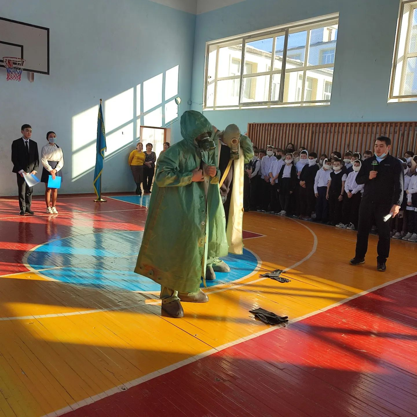 В связи с празднованием международного дня Гражданской Обороны в школе были проведены торжественные линейки по учебным сменам. Все учащиеся имели индивидуальные средства защиты – ватно-марлевые повязки. На линейке выступали члены клуба «Жас сарбаз» по руководством Биекина А. а, так же, учащиеся 11 класса показывали пример оказания первой медицинской помощи во время ЧС.
